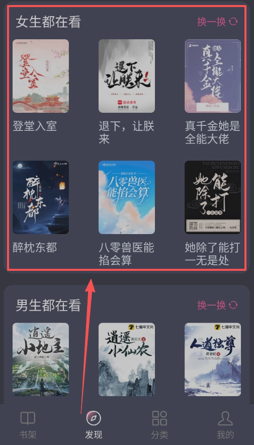 1、刚打开应用看到空书架不用慌,点击页面上方的搜索框,输入书名或作者,或者直接去“发现”页看看大家都在读什么。