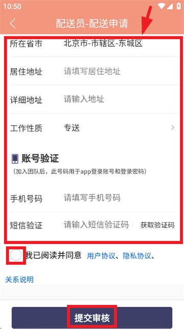 按要求填写相关信息,勾选我已阅读并同意 用户协议、 隐私协议、关系说明,点击提交审核即可