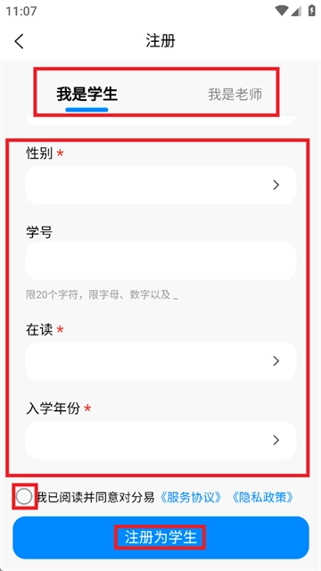 进入注册界面后,先选择身份,如学生注册则选择我是学生,然后根据需求填写相关信息,勾选我已阅读并同意对分易 《服务协议》 《隐私政策》,点击注册为学生即可
