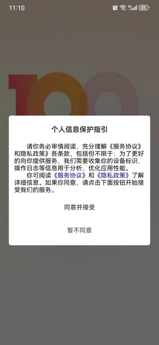 1、打开软件,会看到个人信息保护指引页面,点击下方的同意并接受即可。