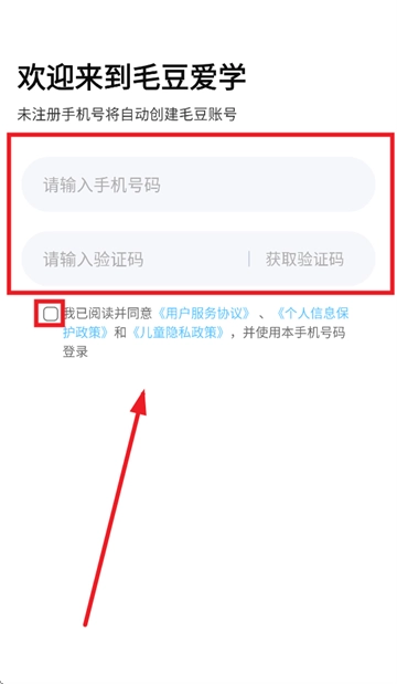 进入登录界面后,输入手机号,验证码,勾选我已阅读并同意 《用户服务协议》 《个人信息保护政策》 》和《儿童隐私政策》,并使用本手机号码登录,点击登录即可,未注册手机号将自动创建毛豆账号