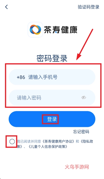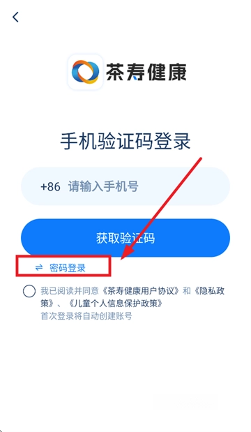 输入手机号,密码,勾选我已阅读并同意《茶寿健康用户协议》和《隐私政策》、《儿童个人信息保护政策》,点击登录即可