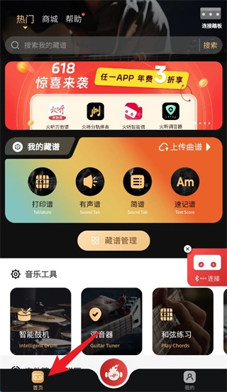 2、首页包含打谱、有声谱、简谱等多类谱库,支持上传、管理和搜索自己收藏的曲谱。