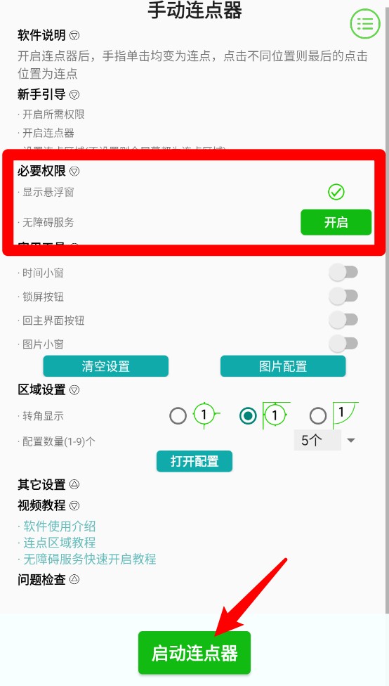 1、首次使用需授予“显示浮窗”和“无障碍服务”权限,启用后可在屏幕上自由执行连点操作。