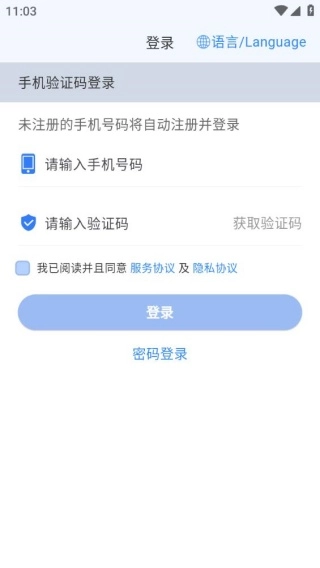 2完成启动页面加载后,跳转至登录界面,依次填写手机号码、验证码,并勾选“我已阅读并同意服务协议及隐私政策”选项。