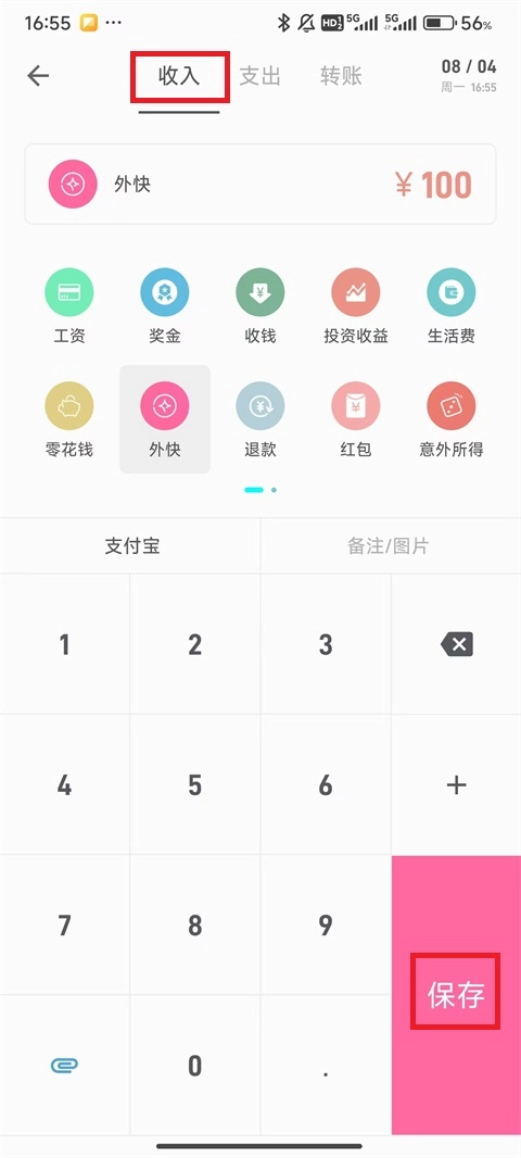 9、同理,点击左上角的“支出”选项,记录对应的收入项目,之后点击右下角的“保存”按钮即可。