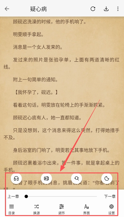 4阅读时,屏幕底部设有上下章切换、目录查看、更换来源、设置调节等功能按钮,若遇到章节内容异常的情况,字体样式与界面布局也可根据个人偏好进行调整。