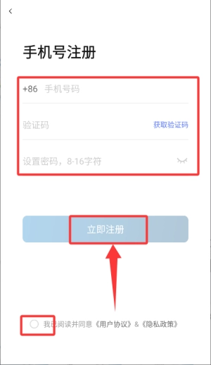 2、使用手机号完成注册,填写号码及验证码并设置登录密码。