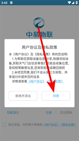 1、打开智慧渔业,在隐私政策弹窗中,点击同意。