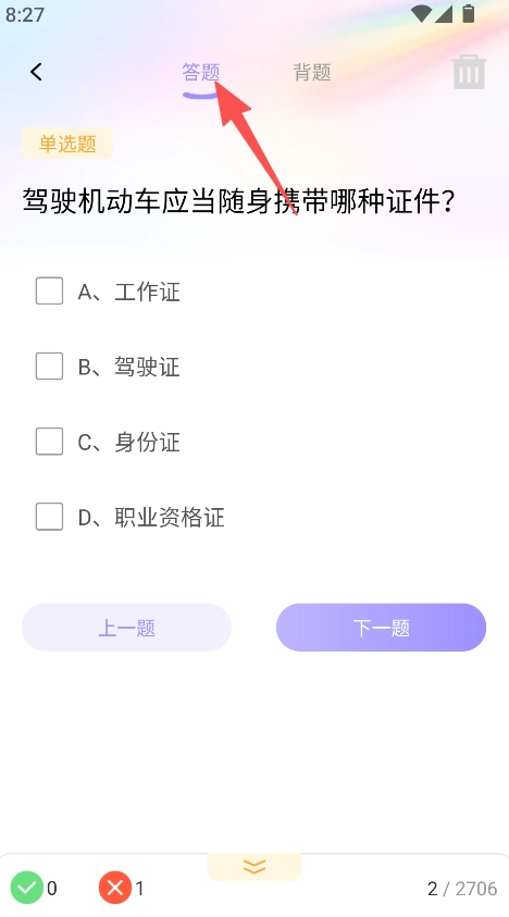 3、呈现的题型主要是单选题,同时配备上一题下一题的切换功能,以此匹配学法减分中常见的题目练习模式,增强练习过程的流畅度和适配性。