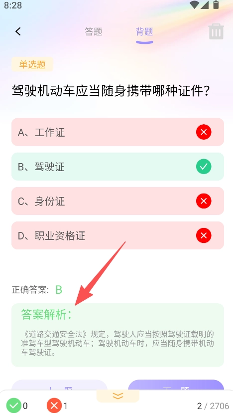3、查看答题结果时,切换至背题板块即可查看正确答案与解析。
