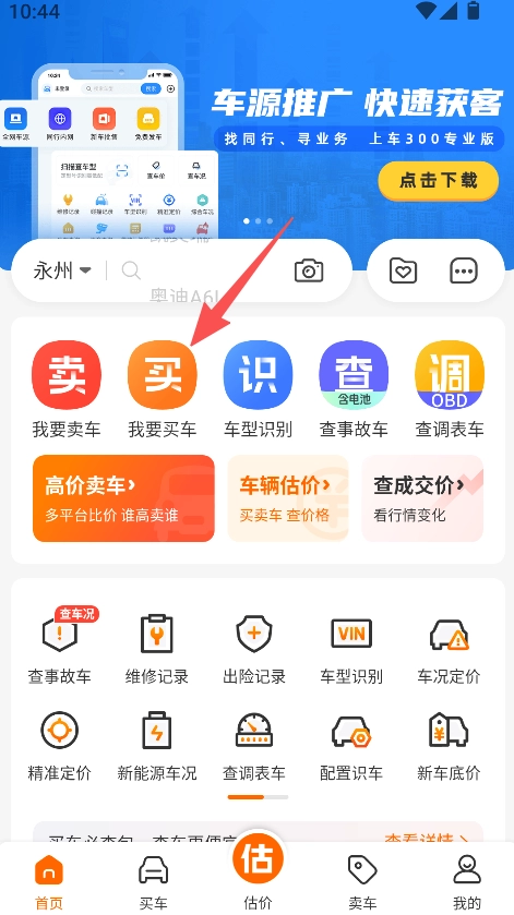 1、打开车三百,点击买选项,进入对应页面,浏览相关功能。