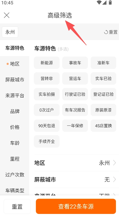 2、使用高级筛选功能,选择车源特色、地区等条件,筛选出目标车源。