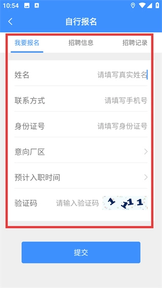 3、在【自行报名】页面的表单里,按顺序填写【姓名】【联系方式】【身份证号】等信息,再选定意向厂区和入职时间。