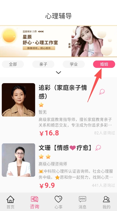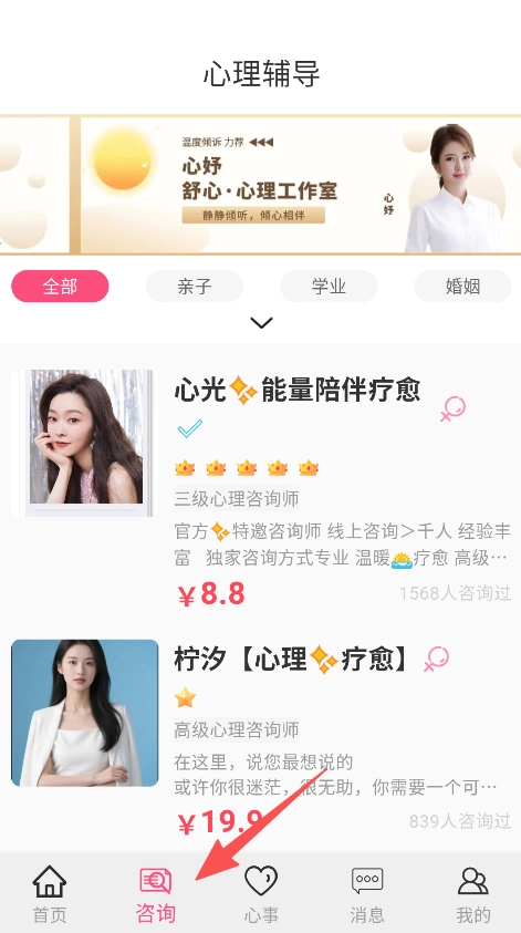 1、提供心理辅导分类筛选功能,可选择亲子、学业、婚姻等分类,筛选对应领域的专业咨询师,定位适配的服务内容。