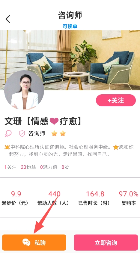 3、支持关注咨询师功能,可长期跟进适配的咨询服务,同时提供私聊及立即咨询渠道,便于快速对接心理辅导服务。