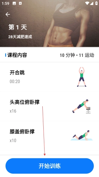 3、在第1天的课程页面,查看完内容后点击【开始训练】按钮,即可进入运动执行页面。