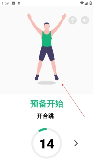 4、进入运动页面后,跟着【开合跳】的动作演示,在倒计时结束前完成该动作训练,就能开启减肥进程了。