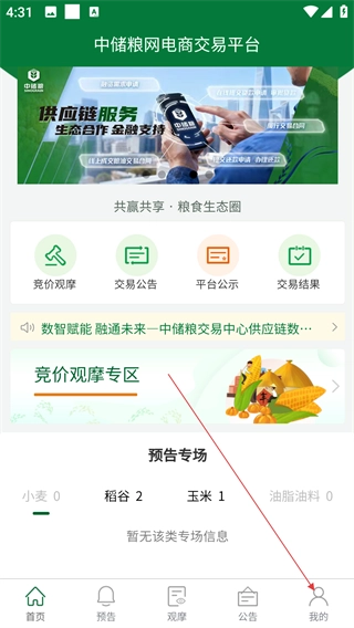 1、在平台首页可查看【竞价观摩】【交易公告】等功能,了解【预告专场】粮食品类,点击底部【我的】进入个人中心。