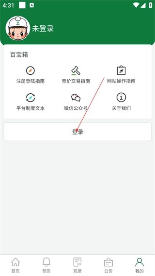 2、进入个人中心后,可通过【注册登陆指南】【竞价交易指南】获取指引,点击“登录”按钮进入账号登录界面。