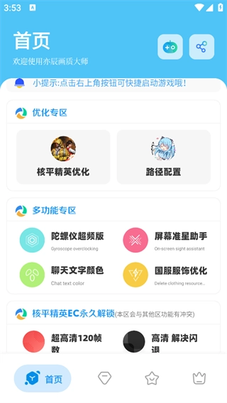 一款非常不错的吃鸡画质助手。软件可以通过软件修改你的游戏的画质,带来各种不同的高清画质体验,帮助你一键调整画质的清晰度,让玩家在玩游戏的过程中有更好的游戏体验,有兴趣的话就来试试看吧。