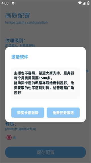 6、配置完成后保存配置他会提示你先激活软件,有两个选择:购买卡密激活和免任务激活,你选择其中一个就好。