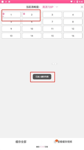 3、选择缓存分辨率及具体集数加入缓存队列;