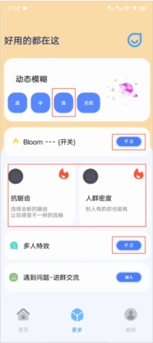 4、接着来到更多页面将页面中的特效、动态模煳都开启。