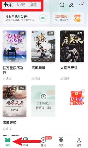 5、最后的书架按钮您可以自行整理自己加入书架的任何小说,同时在上方也拥有历史阅读按钮为你提供便利。