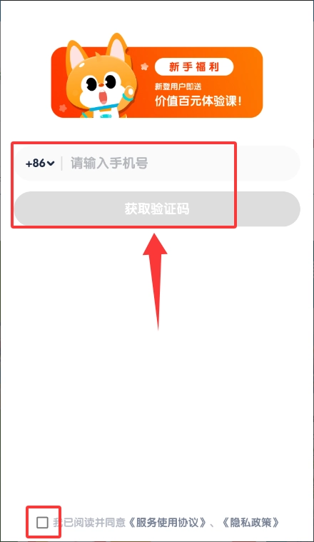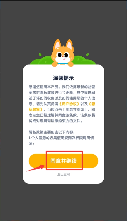 1首次打开应用时,请在弹出的温馨提示窗口中点击“同意并继续”按钮。
