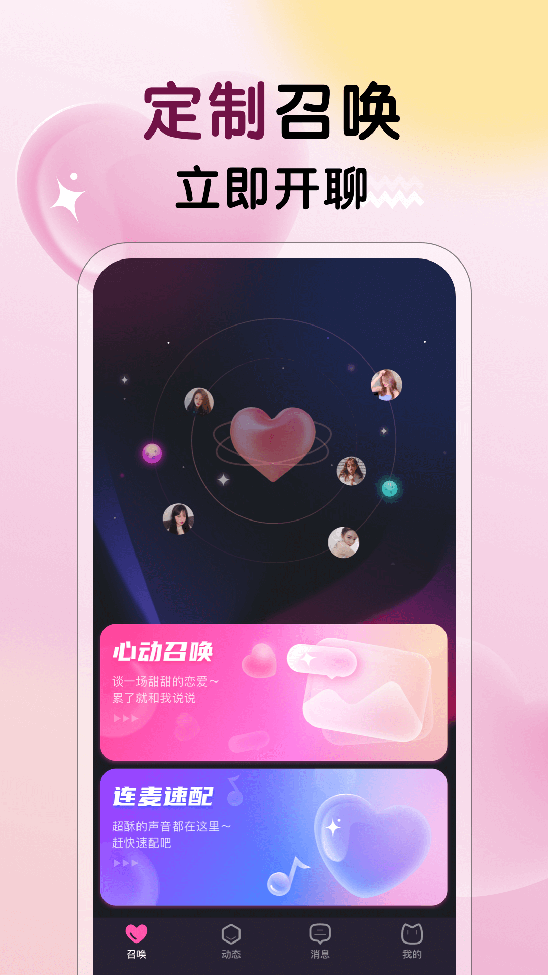 3.语音连麦:包括心动点唱、心动寻音等语音互动功能。用户可以在心动点唱中邀请点唱达人在线挑单,也能在心动寻音中邂逅心动的声音,实现用温暖的声音消灭孤单、随心倾诉的目的。