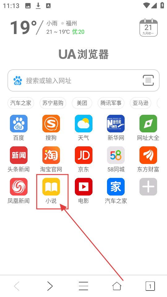 1、启动UA浏览器,点击界面上的【小说】图标,进入小说专区页面,就可以开始找自己想看的小说了。