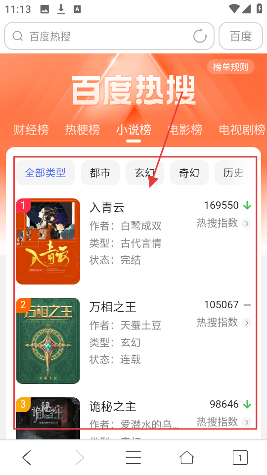 2、在小说页面的百度热搜小说榜单里,找到你要找的目标小说,像《入青云》这类,点击它就能进入小说搜索结果页面啦。