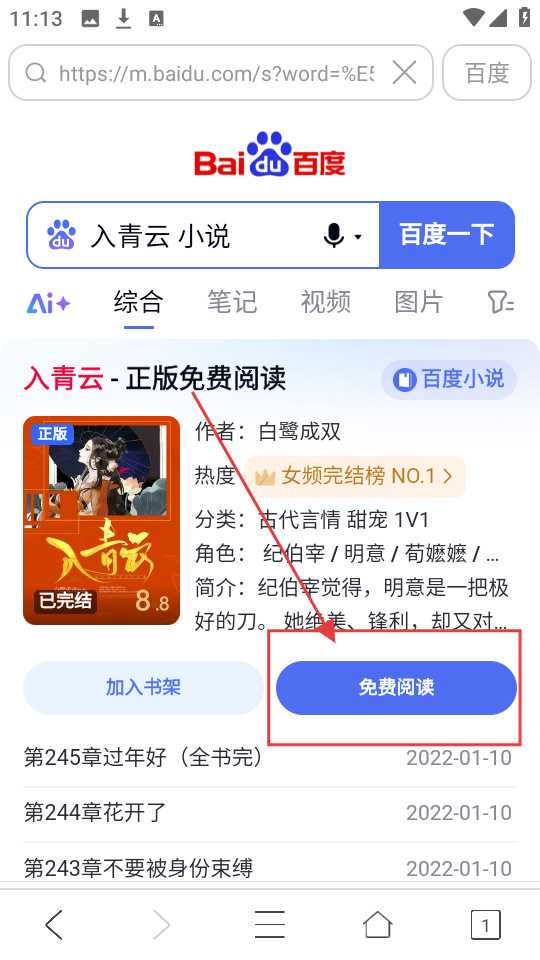 3在搜索结果页面中,找到带有“入青云-正版免费阅读”标识的条目,点击该条目下的“免费阅读”按钮,即可进入小说阅读界面。