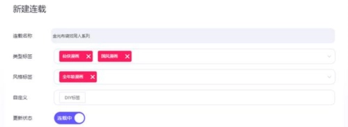 确定后就可以编辑连载作品的名称,风格和类型标签,以及封面和简介。创建时默认状态是连载中,如果是单篇或者已完结的漫画作品,点击切换已完结状态即可,而且更新状态在添加完成后也是可以修改的,不用过多考虑~