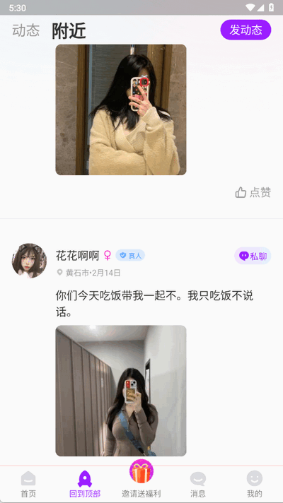 【分享动态】分享每天的心情,偷偷关注你喜欢的人,在动态广场,寻找爱好一致的ta。