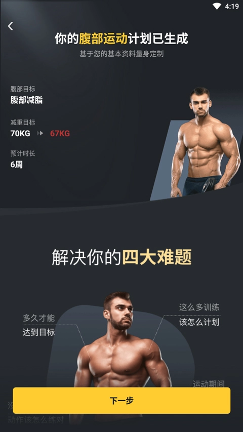 1、启动腹肌撕裂者后,首先需要输入个人身体数据,系统将基于这些信息为你生成专属腹部训练方案;