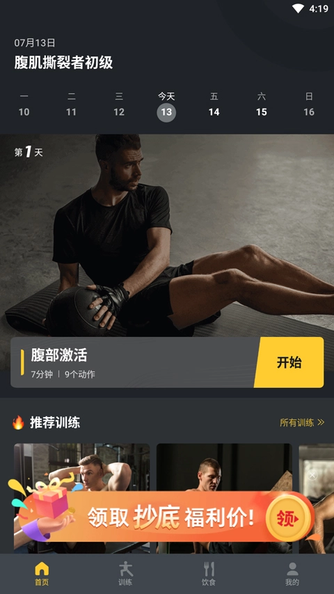2、完成设置后进入主界面,首页中包含丰富的关于腹部训练的相关内容;