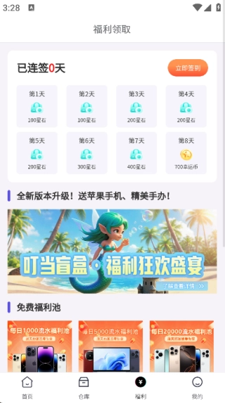 3. 点击页面底部的“福利”选项,就能看到每日签到、免费福利池等相关功能。