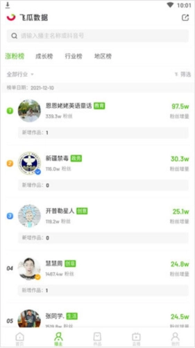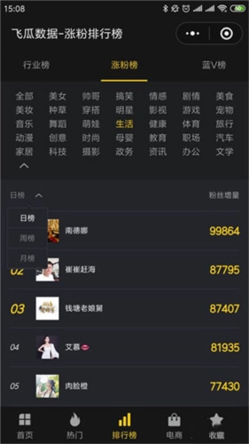 3、除了可以查看当日的,还可以按周榜、月榜查看涨粉榜单,飞瓜数据还可以分行业查看不同行业近期的涨粉黑马数据。