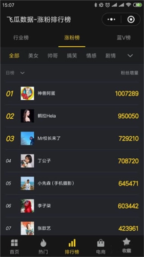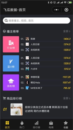 1、飞瓜数据小程序默认打开首页,可以看到当日的抖音行业排行榜、蓝V排行榜,以及涨粉排行榜。