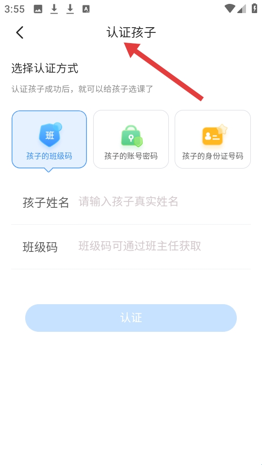 2、此为中认证孩子的页面,标题显示认证孩子提供多种认证方式,如班级码账号密码等,认证后可给孩子选课。