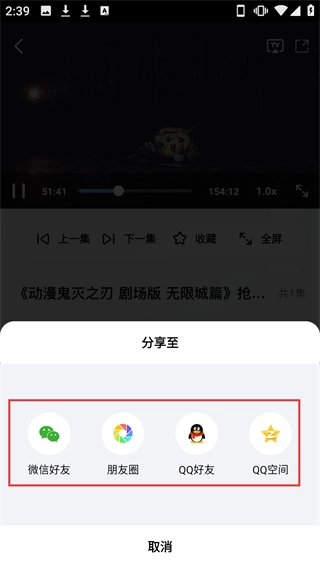 3、在《鬼灭之刃剧场版无限城篇》的播放页面,点击右上角的分享图标,就能打开分享选项弹窗。