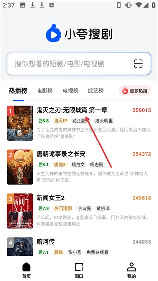 1、在小夸搜剧首页的热播榜区域,点击“鬼灭之刃:无限城篇第一章”所对应的条目,就能触发搜索功能。
