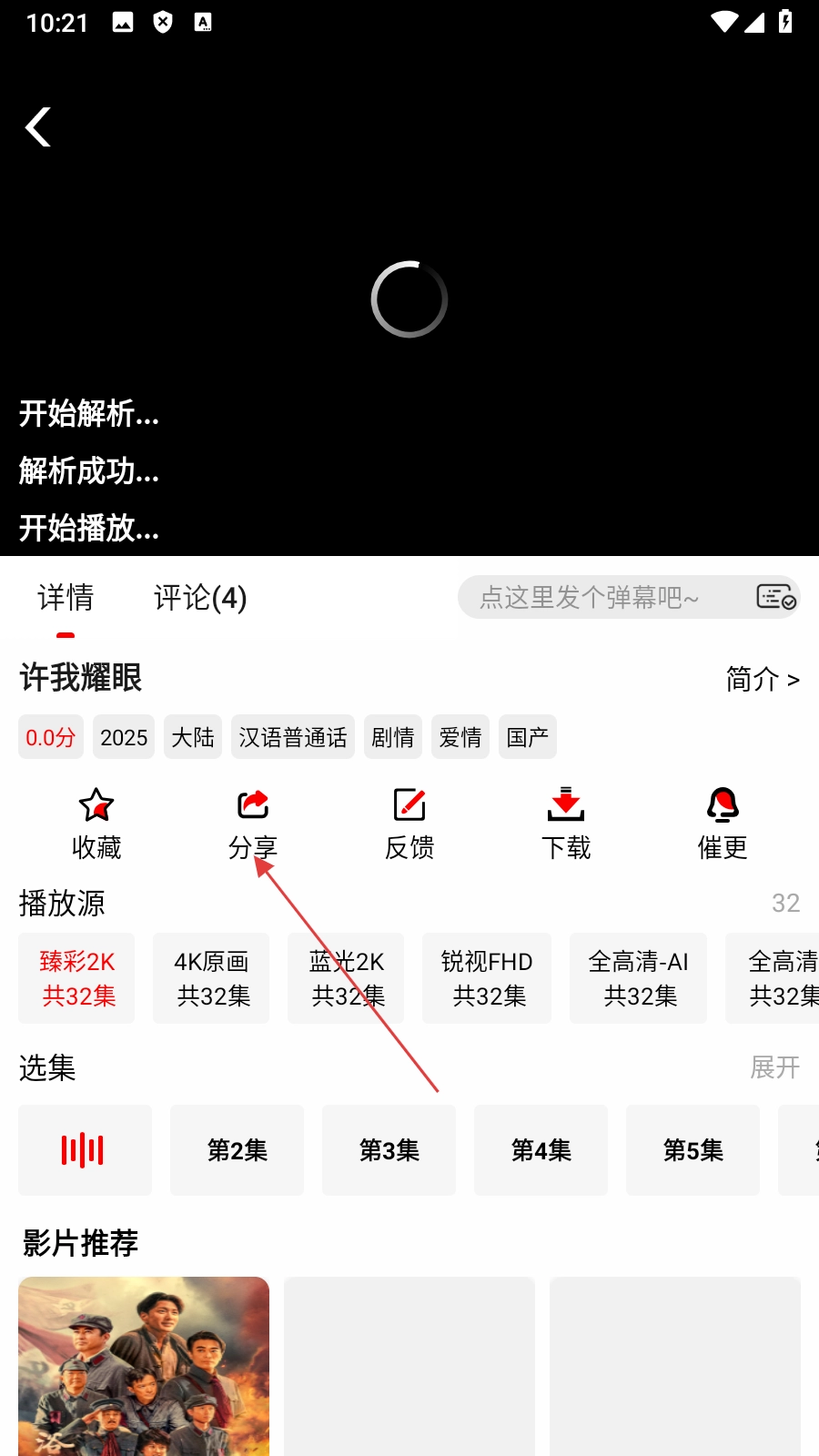 3、在影片播放页面,点击【分享】,弹出分享方式选择框。