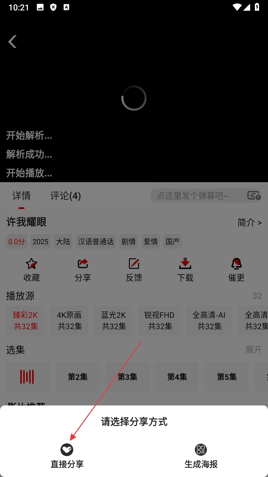 4、在分享方式选择框中,点击【直接分享】,即可完成影片分享操作。