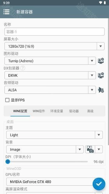 2、点击右上角“+”键,选择“创建新容器”,可修改“容器名称”,里面可以配置具体的分辨率、显卡等,完成后点击右下角勾来完成容器配置。根据不同的游戏,你可以在这里面配置不同的容器,从而在启动不同的游戏时使用不同的容器配置。
