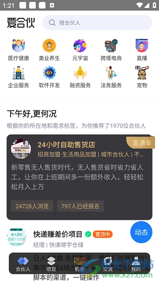 爱合伙是上海合起跃信息技术有限公司为创业者找到到合作伙伴的创业社交软件,此软件聚集着众多的创业者,它被称作创业者的基地,在这里你可以找到各种行业领域的创业人才、技术合伙人、产品合伙人、投资人、运营合伙人等并与之组建团队,并且还可以看到每日创业者的动态及日常,也可以与其他创业者一起探讨创业是的艰辛与困难,共同面对并解决困难,也可以将自身的创业经历写下来分享至讨论区,为其他创业者提供参考。