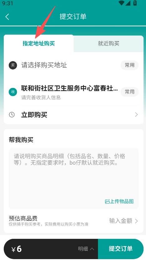 2、具备帮买服务功能支持,用户进入“帮我买”板块后,可说明所需商品的详细信息,选择指定地址购买或就近购买的方式,补充完善收货相关信息,即可发起购物需求。