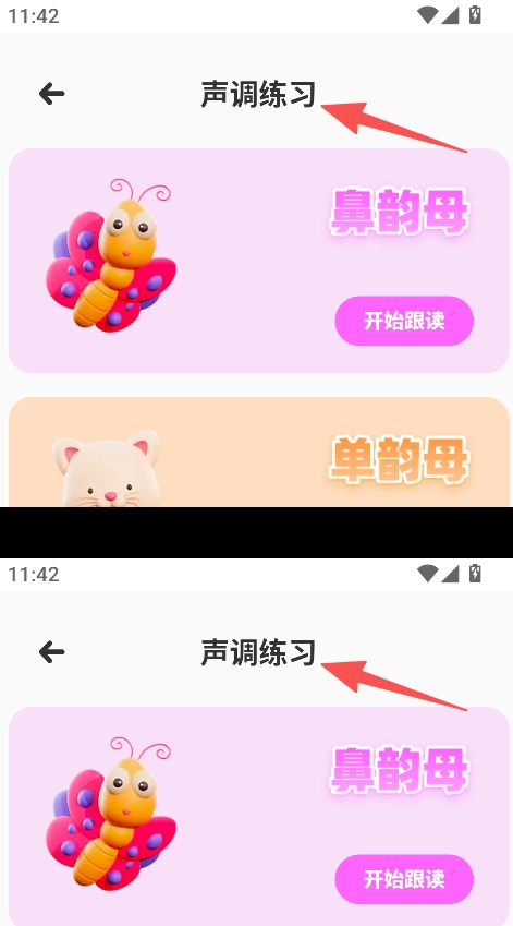 1、进入声调练习,选择鼻韵母、单韵母或复韵母,点击开始跟读,练习声调发音。